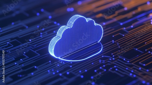 Futuristic digital cloud technology concept with glowing circuitry background, representing cloud computing and data network.