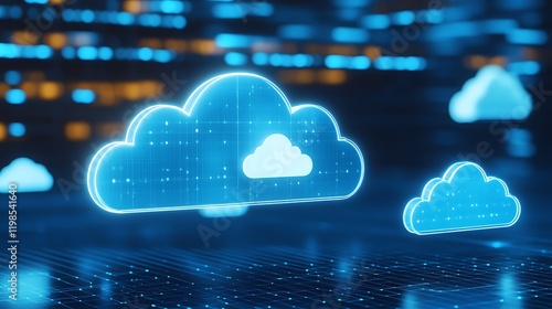 Futuristic Digital Clouds With Neon Glow Over Flowing Data Stream Representing Cloud Computing Technology