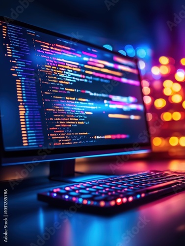 Futuristic digital coding and programming abstract background with neon glowing lights digital data and cyberpunk inspired display Conceptual image for software development information technology