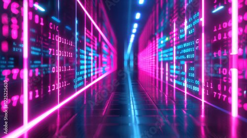 Futuristic digital corridor with glowing binary code and neon lights, creating vibrant atmosphere of technology and data flow