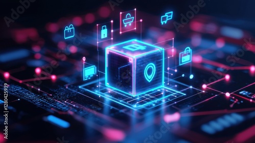 Futuristic Digital Cube with Icons Representing Technology, Security, and Data Connectivity in a Virtual Environment