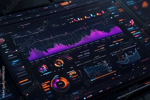 Futuristic digital dashboard displaying data analytics and graphs.