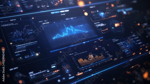 Futuristic digital dashboard displaying data analytics and visualizations.