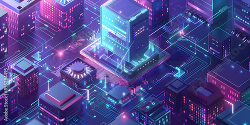 Futuristic digital data center integrated with advanced technology. It features a server on circuit board surrounded by various digital elements, cloud computing, data storage, and cyber technology