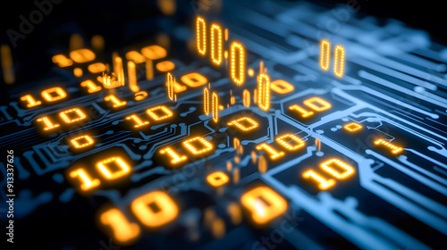 Futuristic digital data flowing through intricate circuit patterns with binary codes electronic signals and technological innovations