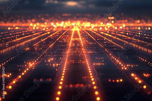 Futuristic Digital Data Stream with Bright Orange Lights on Dark Background