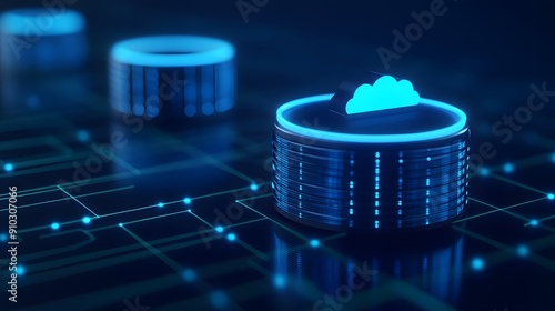 Futuristic digital database with cloud technology, glowing blue cyber network background. Concept of data storage and cloud computing.