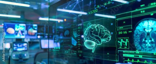 Futuristic digital display showing brain imagery and data in high-tech laboratory.