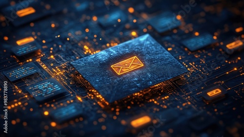 Futuristic Digital Email Icon on a Circuit Board with Glowing Lights and Technological Elements