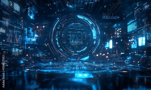 Futuristic digital environment with glowing interfaces and circular portal.