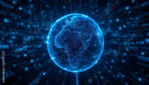 Futuristic digital globe on dark blue tech background