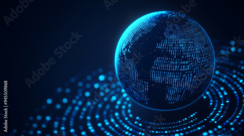 Futuristic digital globe with binary code and data streams, symbolizing global tech