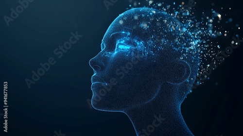 Futuristic digital human profile composed of particles and data, symbolizing artificial intelligence, technology, and human-computer interaction in a virtual space.