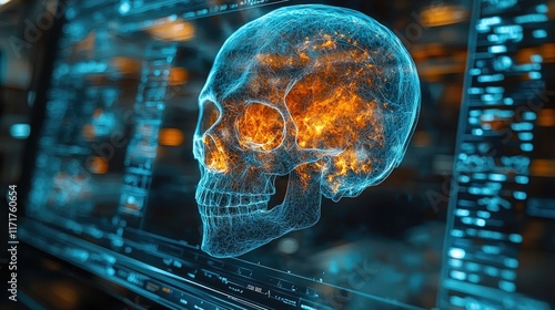 Futuristic digital human skull with data overlay and neural network visualization