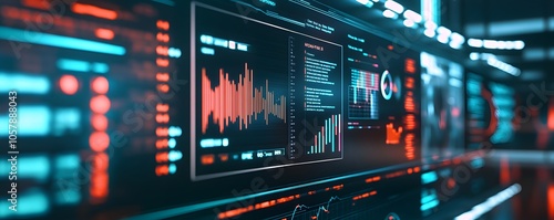 Futuristic digital interface displaying graphs and data metrics in vibrant colors for technology and analytics themes.