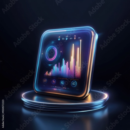Futuristic digital interface displaying vibrant data visualizations and analytics on a glowing platform.