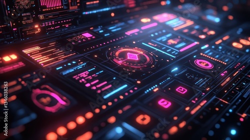 Futuristic digital interface displaying vibrant data visuals and metrics in a high-tech environment