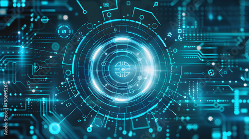 Futuristic digital interface with a central circular element with motherboard or electronic system background