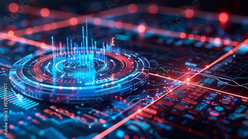 Futuristic digital interface with abstract circuit board and glowing data visualization, representing advanced technology and innovation.