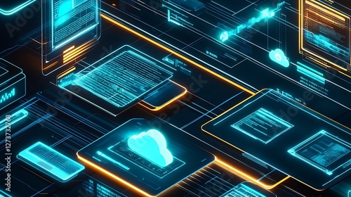 Futuristic Digital Interface with Cloud Technology and Data Visualization Concepts : Generative AI
