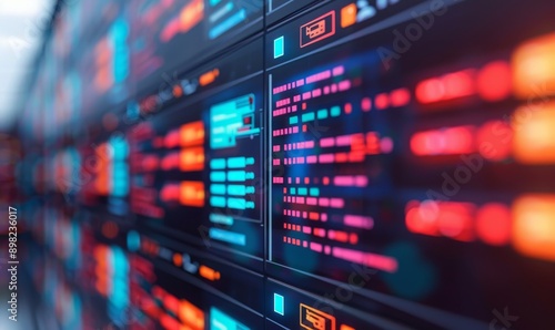 futuristic digital interface with colorful data and information on a large screen wall.