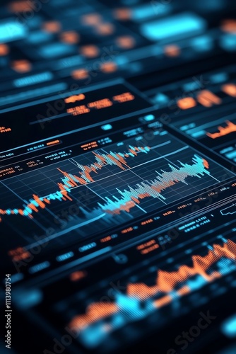 Futuristic digital interface with dynamic data visualizations and glowing graphs.