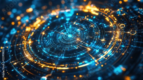 Futuristic digital interface with glowing blue and orange circuit patterns