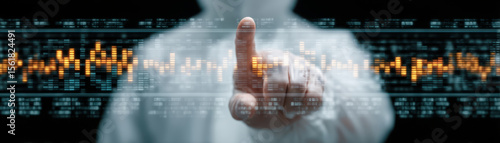 Futuristic digital interface with glowing data charts and hand interacting, symbolizing advanced technology and innovation