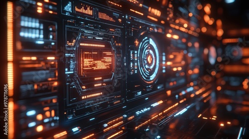 Futuristic digital interface with glowing elements and patterns.