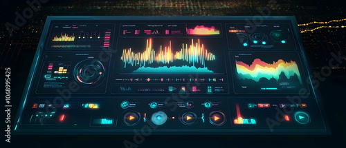 Futuristic digital interface with glowing graphs, charts, and buttons.