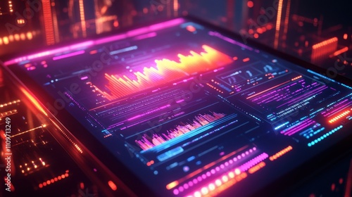 Futuristic digital interface with glowing neon lines and charts.