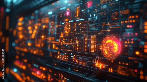 Futuristic Digital Interface with Glowing Orange and Red Lights