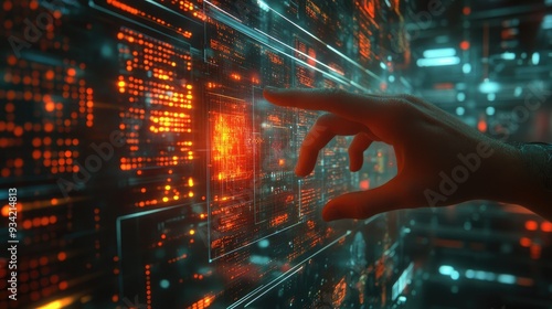 Futuristic Digital Interface with Hand Interaction and Glowing Orange Data Panels