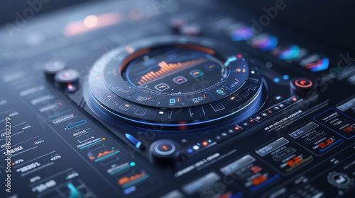 Futuristic digital interface with holographic displays, data visualization, and interactive elements in a high-tech design.