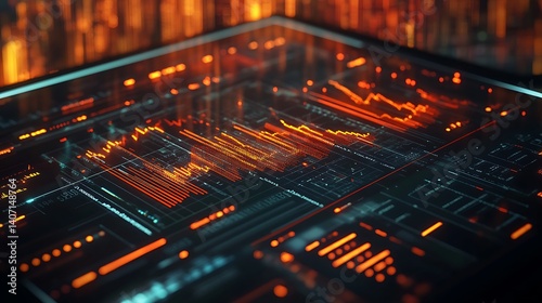 Futuristic Digital Interface with Orange Graphs, Futuristic digital interface with glowing orange graphs and data visualizations on a dark background
