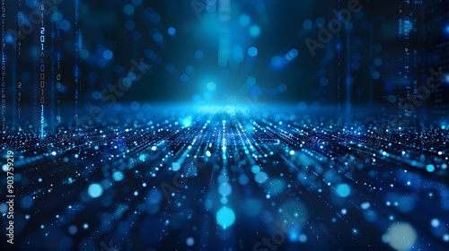 Futuristic Digital Landscape with Glowing Particles and Binary Code