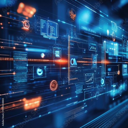 Futuristic Digital Network Interface Showing Data Flow and Information Technology Processes