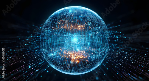 Futuristic digital sphere with binary code on glowing wave background.