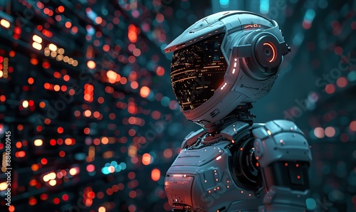 Futuristic digital tech of data processing: Artificial intelligence technology conceptual vertical banner with robot or cyborg analyzing big data.