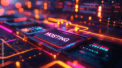 Futuristic Digital Technology Hosting Network with Glowing Server Interface and Vibrant Colors