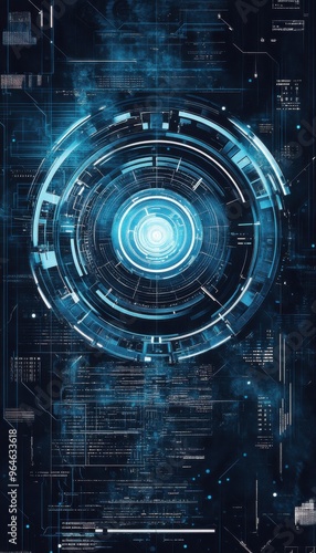 Futuristic digital technology interface design for mobile phone wallpaper with a sci-fi inspired circular pattern and blue neon elements