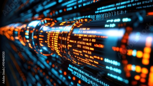 Futuristic digital tunnel with glowing binary code and vibrant data streams, symbolizing technology and data processing.