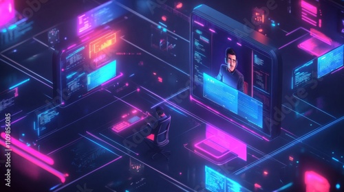 Futuristic Digital Workspace with Virtual Communication and Coding