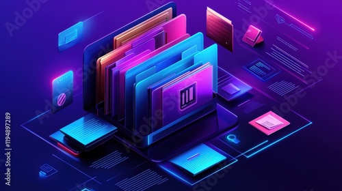 Futuristic Document Management System Visualization with Colorful Folders, Digital Files, and Abstract Data Elements in a High-Tech Environment
