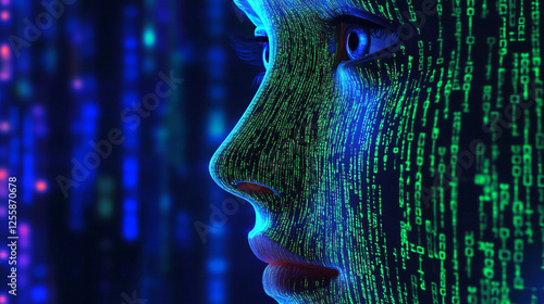 Futuristic Face with Digital Data Flow Illustrating Technology and Artificial Intelligence Concepts