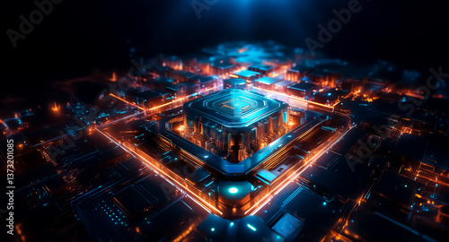 Futuristic geometric structure with vibrant orange and blue lights illuminates the dark. Abstract digital design from an aerial perspective.