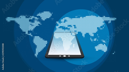 Futuristic Global Technology, Networking and Cloud Computing Design Concept with Spotted World Map and Tablet PC - Digital Network Connections, Technology Background