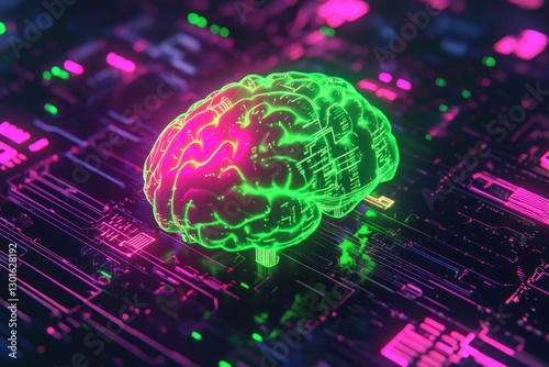 Futuristic glowing brain on a circuit board.