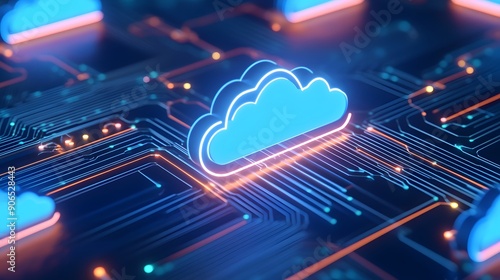 Futuristic glowing cloud computing technology and network concept with circuit board and data storage representation.