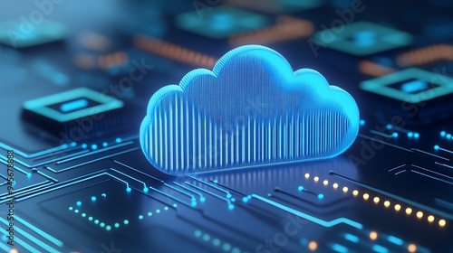 Futuristic glowing cloud icon on a circuit board, representing cloud computing, data storage, and technology integration.
